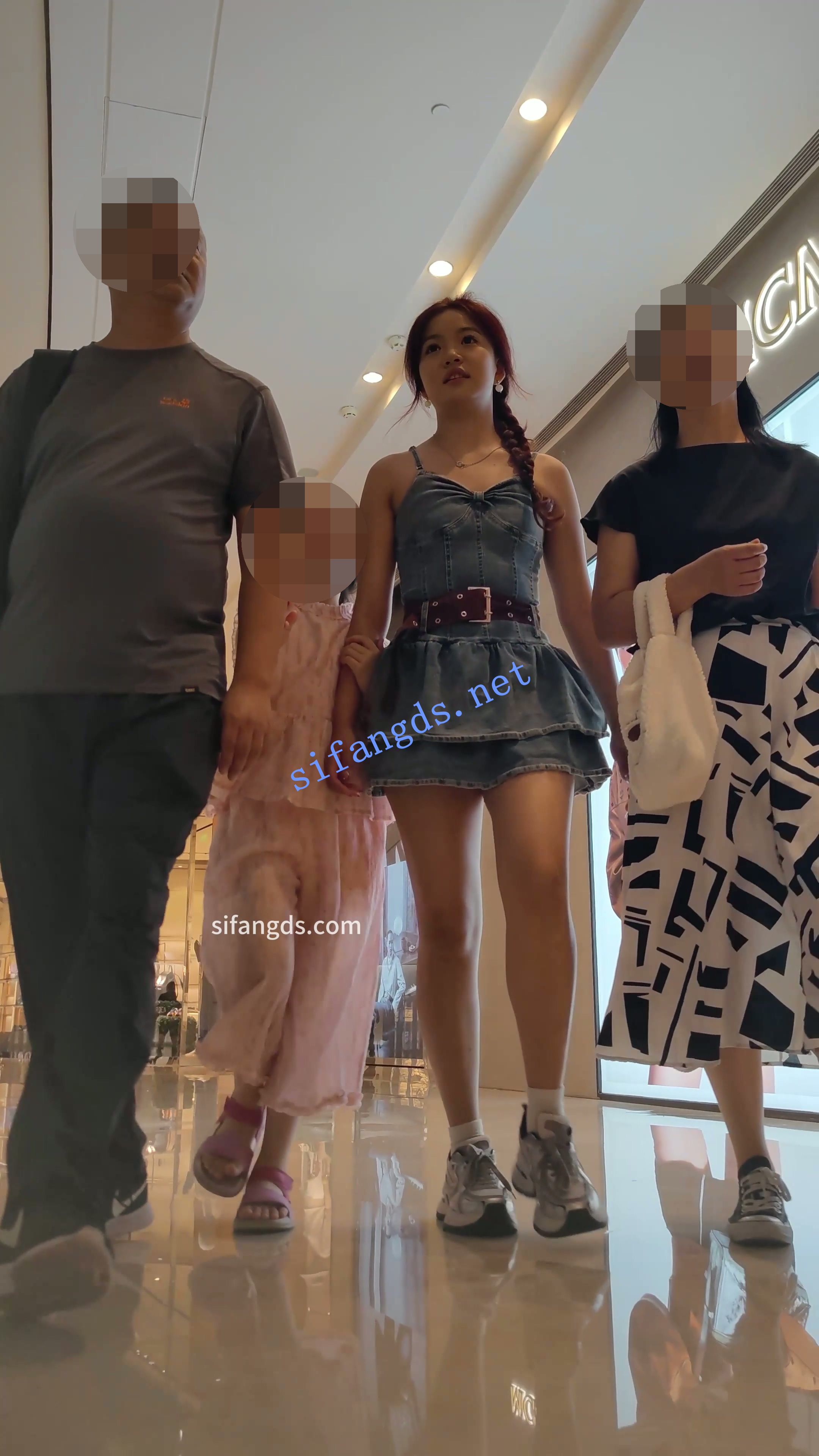 【CSCD】蓝色牛仔超短连衣裙美女和家人出来逛街,黄色内